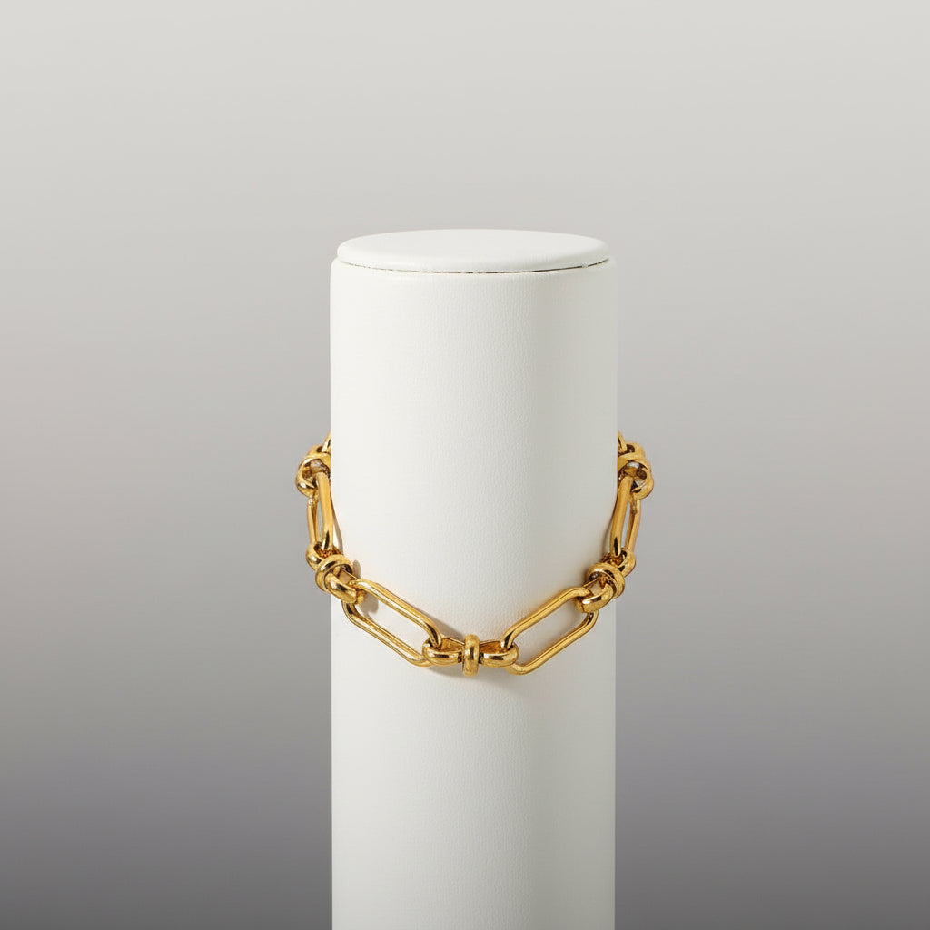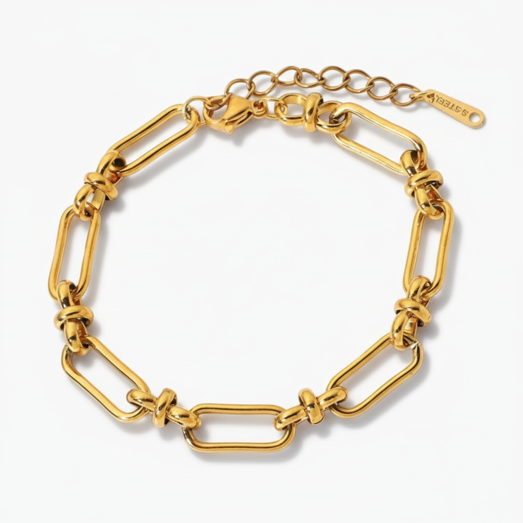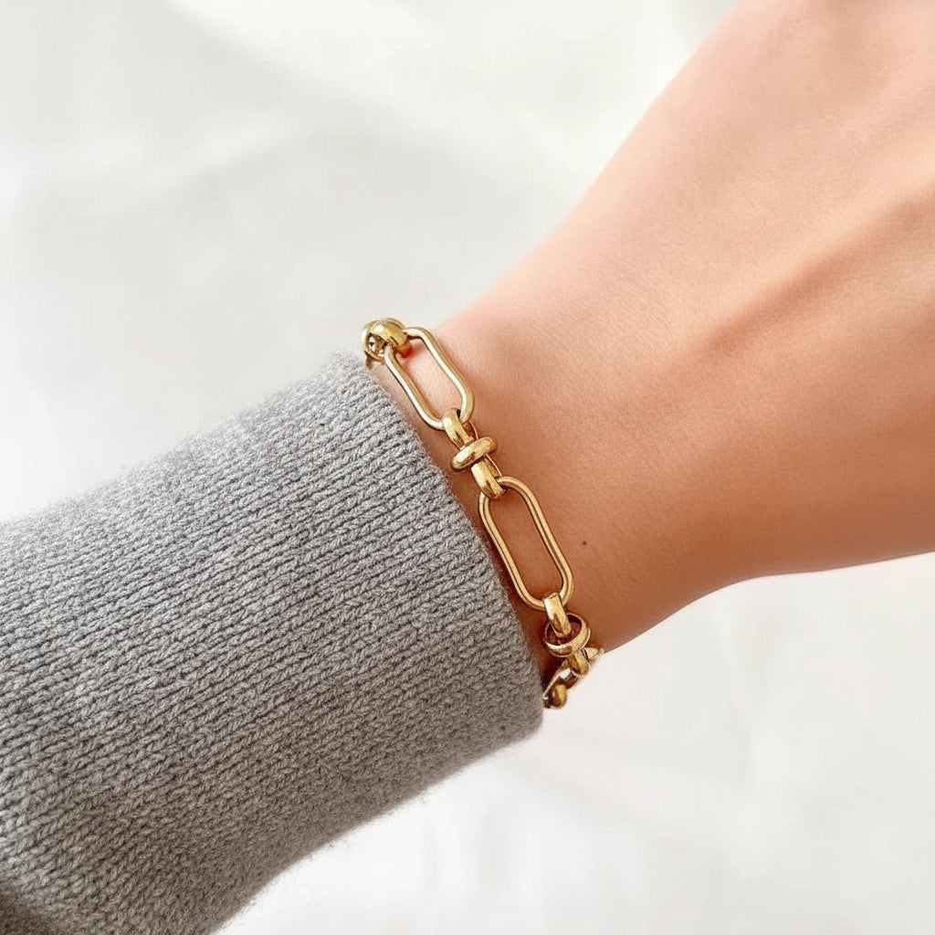 The Maeve Gold Link Chain Bracelet combines refined aesthetics with practical durability. Its distinctive paperclip chain design, rendered in premium stainless steel-plated 18k gold, resists water, sweat, and heat without compromising its lustrous finish. The hypoallergenic composition suits all skin types, while the 7mm width strikes an elegant balance between understated and statement-making. At just 9 grams, it delivers substantial presence without weight. The adjustable 7-inch length with 2-inch extension ensures a customized fit, making it equally suited to layering or solo wear. Packaged sustainably, this bracelet represents a conscientious investment in everyday luxury.