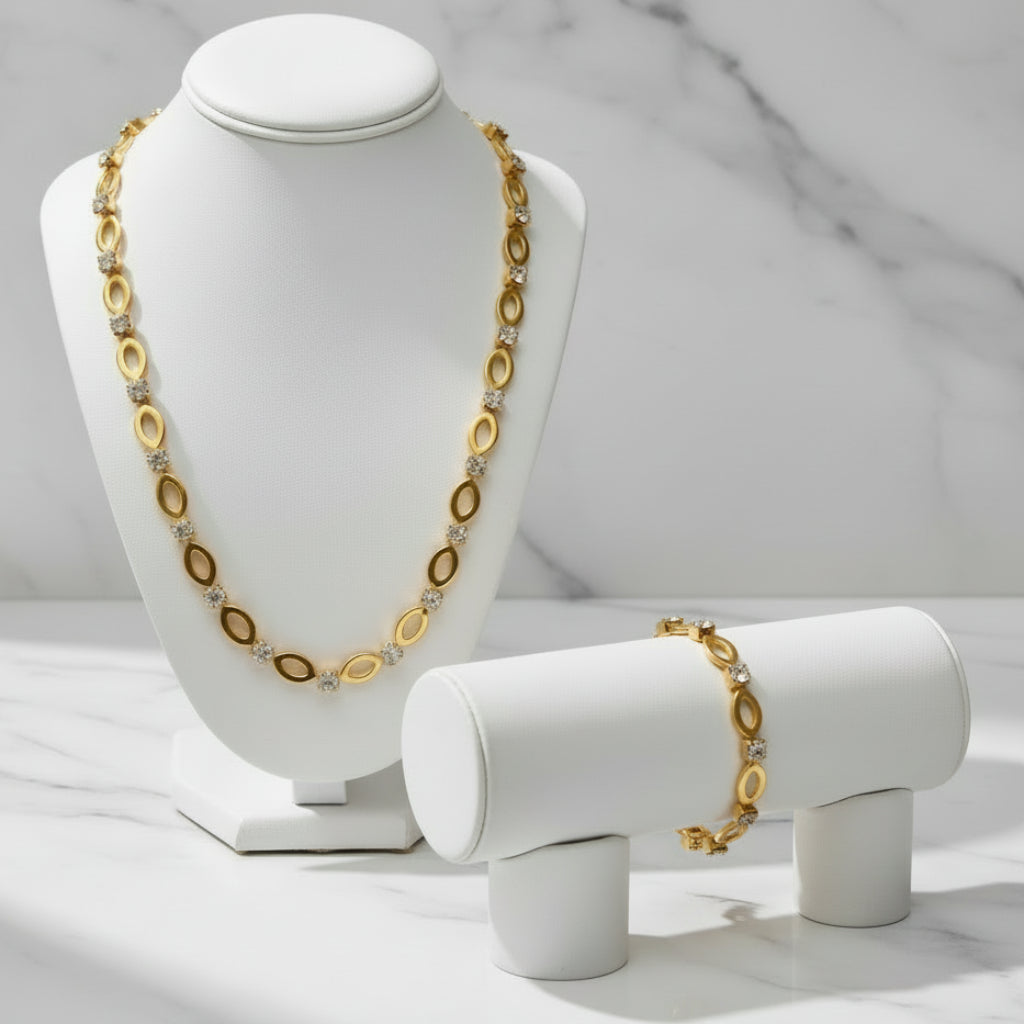 A refined blend of gold-toned marquise links and delicate sparkling stones, this necklace and bracelet set offers timeless, effortless elegance. Lightweight and polished, it complements both everyday outfits and special-occasion looks with a subtle, graceful shine.