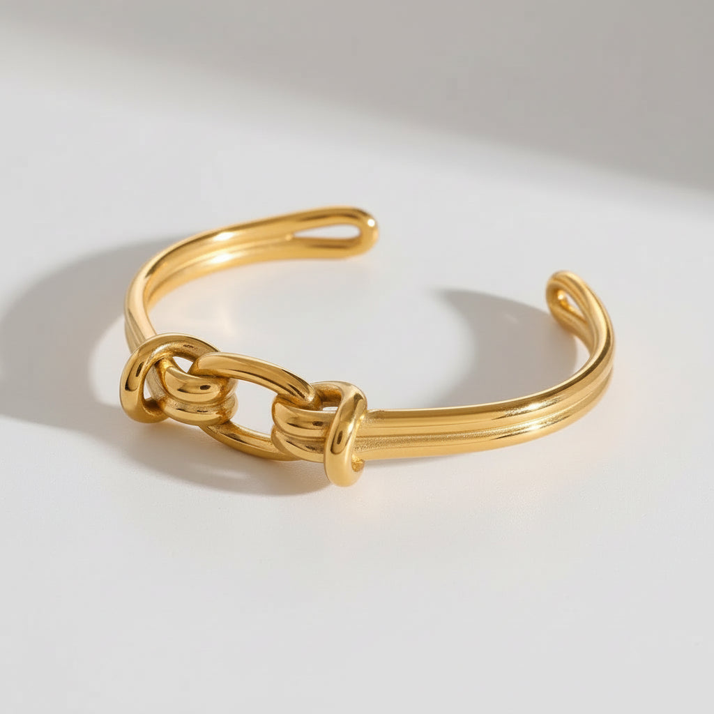 The Naomi Gold Knot Bangle combines understated sophistication with everyday practicality. Crafted from stainless steel with 18k gold plating, this minimalist piece resists water, sweat, and heat while remaining gentle on sensitive skin. At 58mm inner diameter and 26g, it's lightweight yet substantial. Sustainably packaged and designed to complement any wardrobe.
