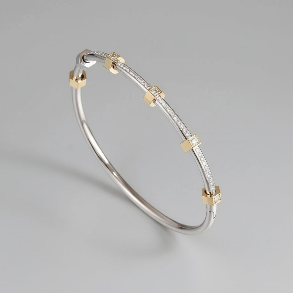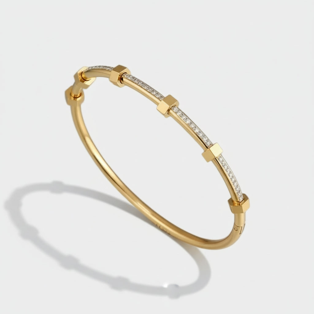 A sophisticated bangle combining diamonds and hexagonal accents in durable stainless steel, copper, and zircon. Available in gold or silver with a 6.5cm diameter for comfortable wear. The polished finish delivers understated elegance for any occasion.