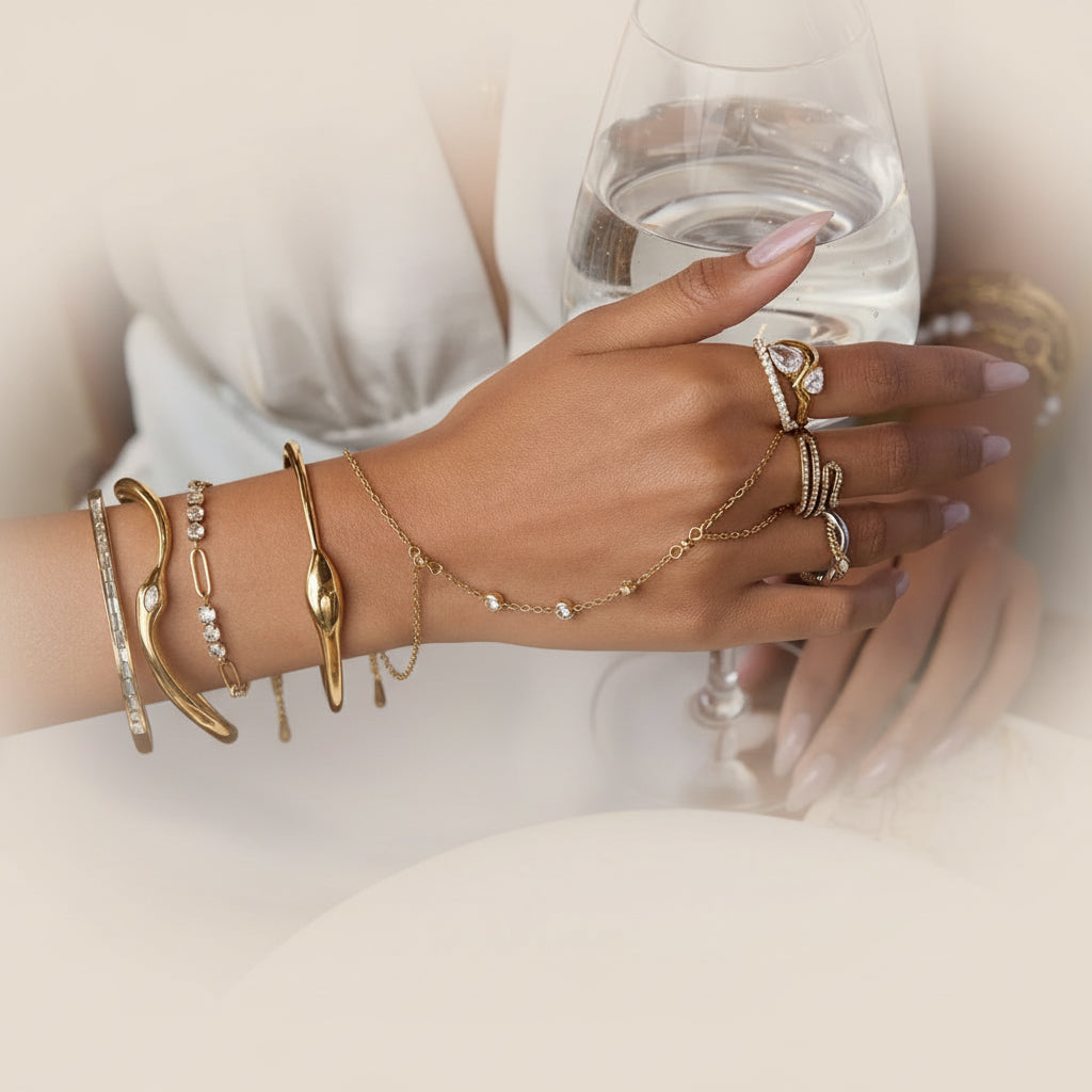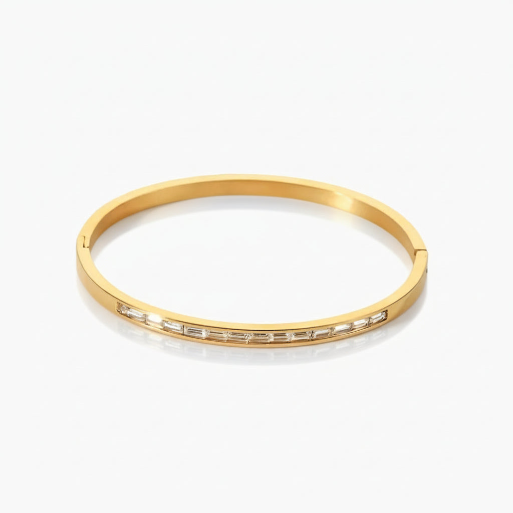 The Orla Gold Diamond Bangle pairs refined aesthetics with practical durability. Featuring stainless steel-plated 18k gold and AAAAA diamond simulants, this bangle withstands water, sweat, and heat without compromising its finish. Its hypoallergenic construction makes it ideal for sensitive skin, delivering comfortable all-day wear across any setting. Dimensions: 59mm length, 12.9g weight.