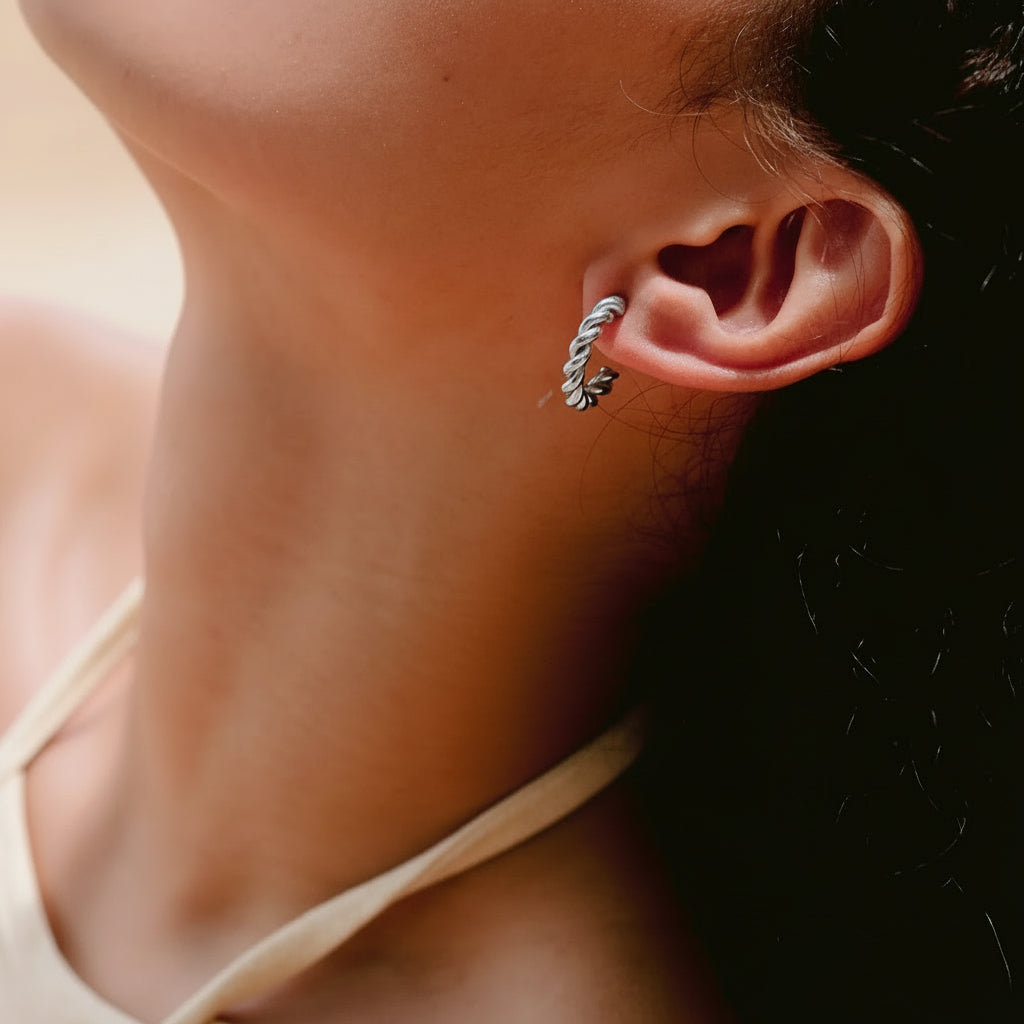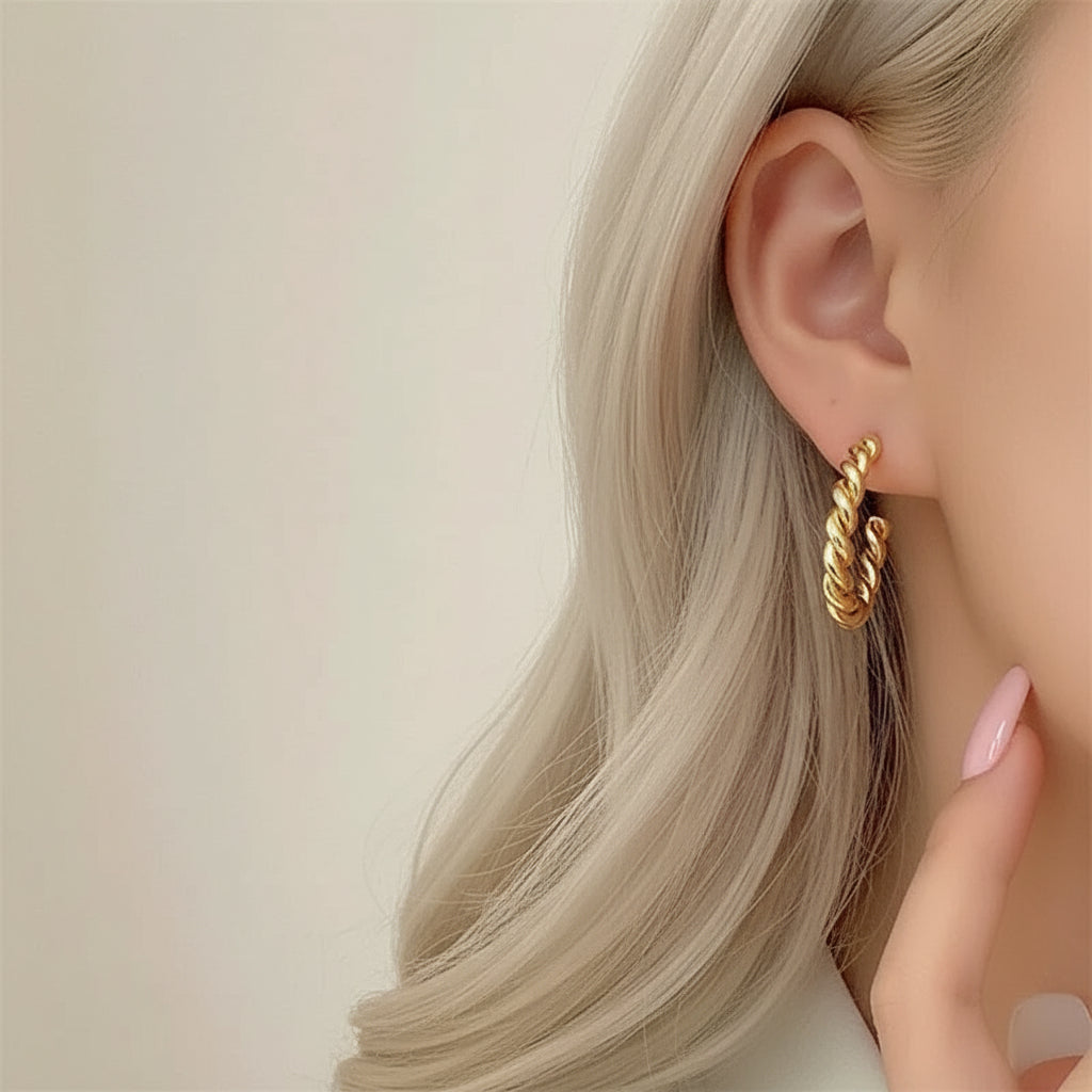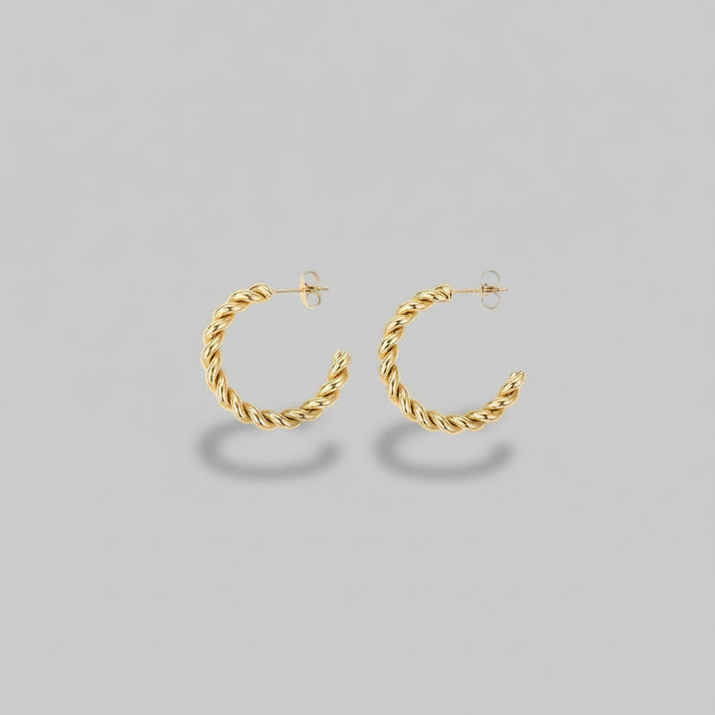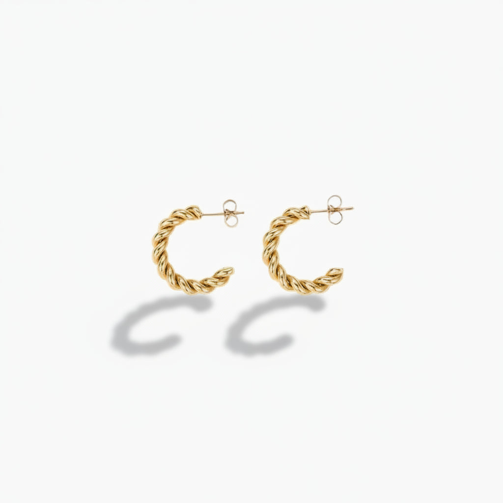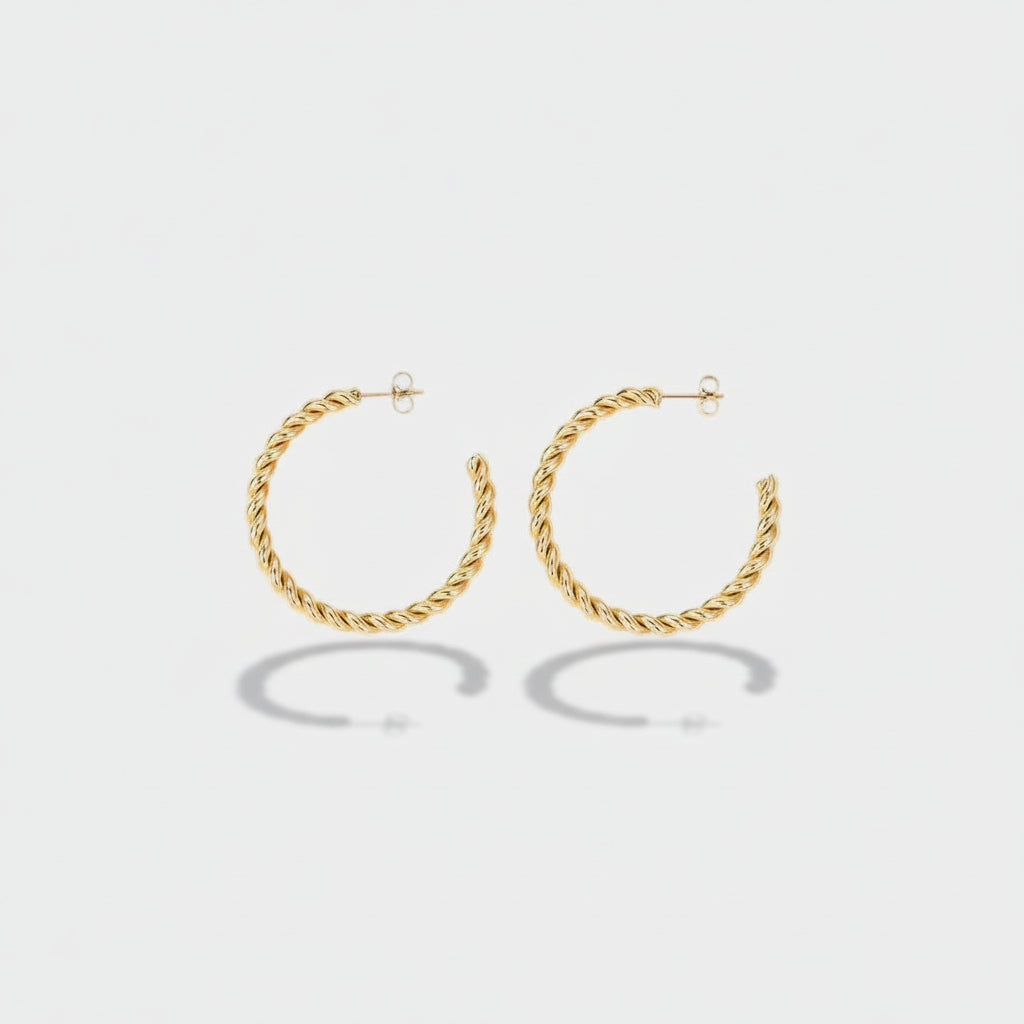 The Reeva Twist Earrings combine contemporary design with refined craftsmanship. Constructed from ethically sourced stainless steel and finished with 14k gold plating, these earrings deliver a sophisticated aesthetic that transitions seamlessly from day to evening. Their distinctive twisted silhouette adds visual interest without compromising wearability. Engineered to resist water, perspiration, and heat, they maintain their lustrous appearance through daily wear. The hypoallergenic composition makes them an excellent choice for discerning wearers with sensitive skin. Presented in sustainable packaging that reflects our commitment to responsible luxury.