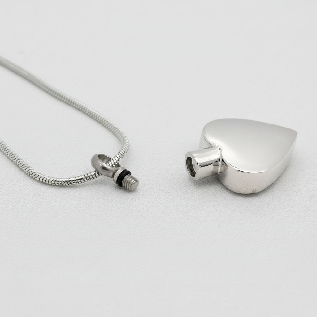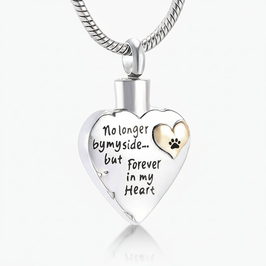 Honour cherished memories with the Lumora Forever in My Heart Pendant, a sophisticated memorial piece crafted from premium stainless steel. The design features a rustic silver-tone outer heart cradling a delicate gold-tone inner heart, engraved with your choice of relationship—Brother, Dad, Daughter, Grandma, Grandpa, Mom, Sister, or Son—or left plain for personal customization. The front inscription reads "No longer by my side…but forever in my Heart," offering a poignant tribute to those you hold dear. The pendant's secure compartment discreetly holds a small portion of cremains, allowing you to carry your loved one with you always. Each piece arrives with an elegant 22" silver-tone chain and protective microfiber pouch, making it a meaningful keepsake or thoughtful gift.