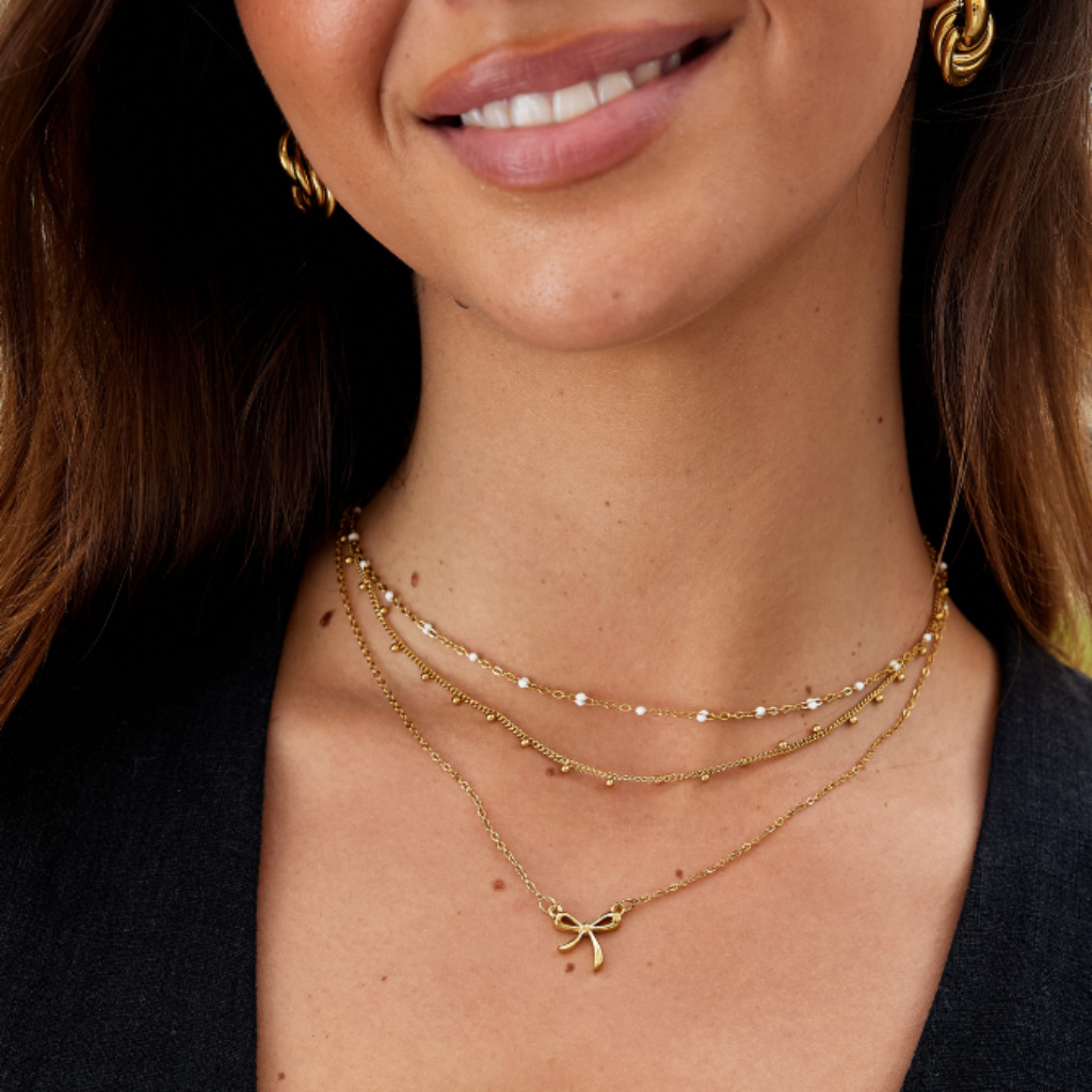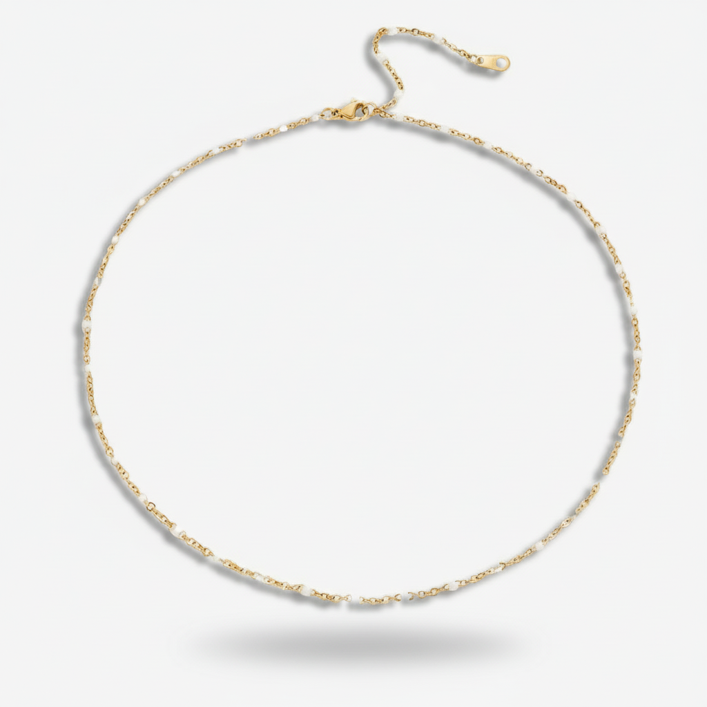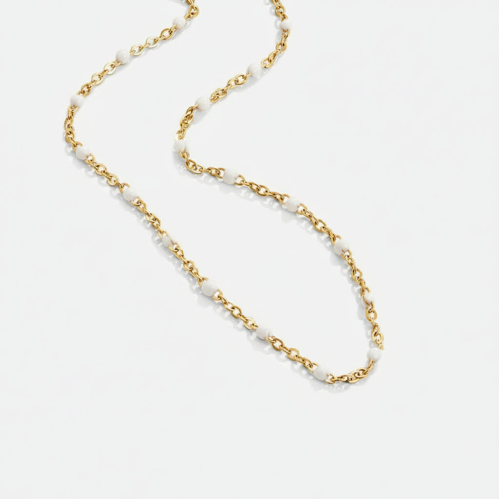 Elevate your everyday style with the Noa White Bead Necklace, a refined piece that seamlessly transitions from casual to formal settings. Constructed from premium stainless steel with an 18K gold-plated finish, this necklace delivers both durability and sophistication. The waterproof, tarnish-resistant design ensures lasting brilliance through daily wear, while the hypoallergenic composition free from lead and nickel makes it ideal for discerning wearers with sensitive skin. Featuring an adjustable length ranging from 15.75 to 18.11 inches, the Noa adapts to your preferred fit with effortless versatility.