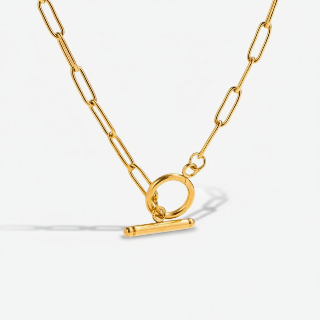 The Odette Gold Necklace merges contemporary design with refined craftsmanship. Its distinctive paper-clip chain interlocks geometric bars and circles into a sculptural statement piece that elevates any wardrobe. Constructed from stainless steel with 18k gold plating, this necklace resists water, perspiration, and heat without fading or tarnishing. The hypoallergenic composition ensures compatibility with sensitive skin, while its durability makes it suitable for daily wear across varied environments. Presented in sustainable packaging, the Odette reflects both aesthetic sophistication and environmental responsibility.