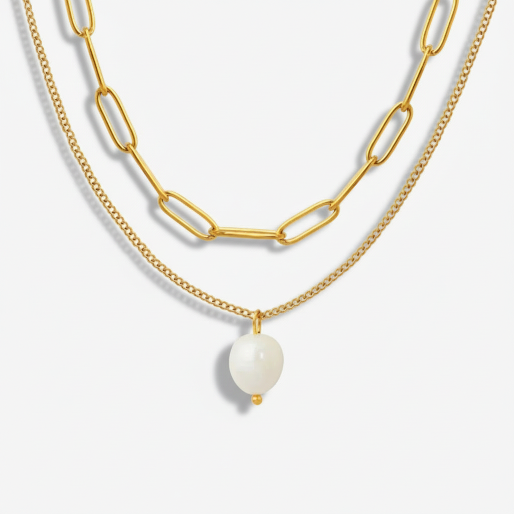 Embrace oceanic elegance with the Safiya Freshwater Pearl Necklace, where contemporary design meets timeless sophistication. This expertly crafted piece combines a sleek paperclip chain with a luminous 9mm freshwater pearl, creating a versatile accessory for any occasion. Constructed from ethically sourced stainless steel with 18k gold plating, the Safiya delivers both durability and refined aesthetics. Its fully waterproof construction withstands daily wear from aquatic activities to intense workouts without compromising integrity or appearance. The hypoallergenic composition ensures compatibility with sensitive skin, while superior resistance to water, perspiration, and heat prevents discoloration. Available in two lengths (15 inches and 23 inches, each with 2-inch extensions), this necklace adapts to your personal style. Weighing just 10g, it offers comfortable all-day wear. Packaged sustainably, the Safiya reflects a commitment to both quality craftsmanship and environmental responsibility.
