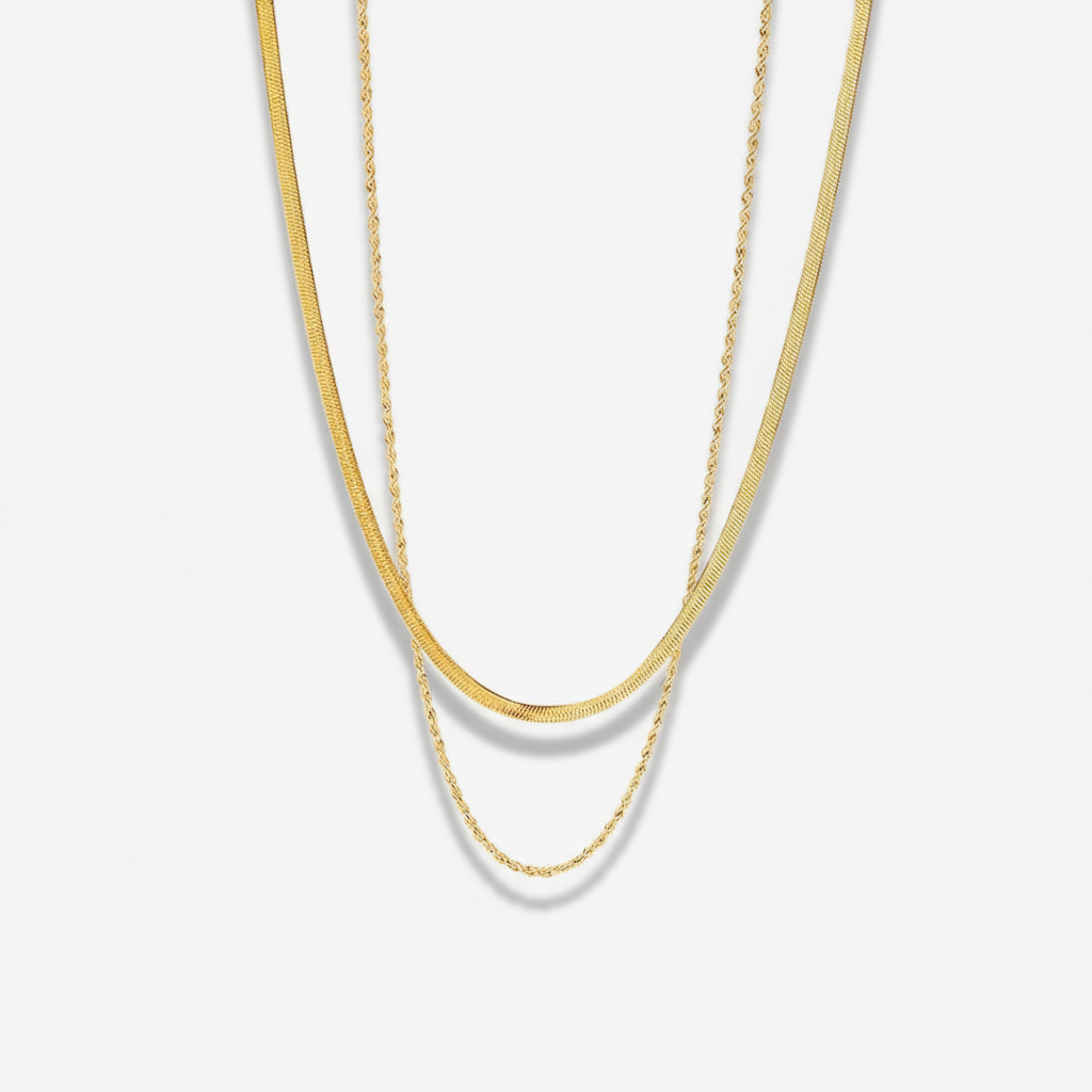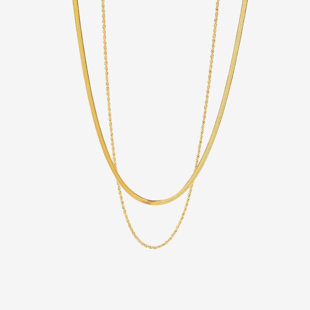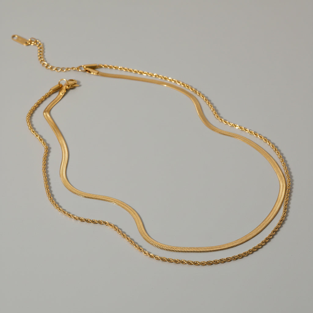 Sienna is a layered gold chain necklace featuring two strands of delicate chains in varying lengths and textures. Crafted from ethically sourced stainless steel with 18k gold plating, it resists water, sweat, and heat without tarnishing. Hypoallergenic and suitable for all skin types, this versatile piece transitions seamlessly from day to evening wear. Arrives in eco-friendly packaging, perfect for gifting.