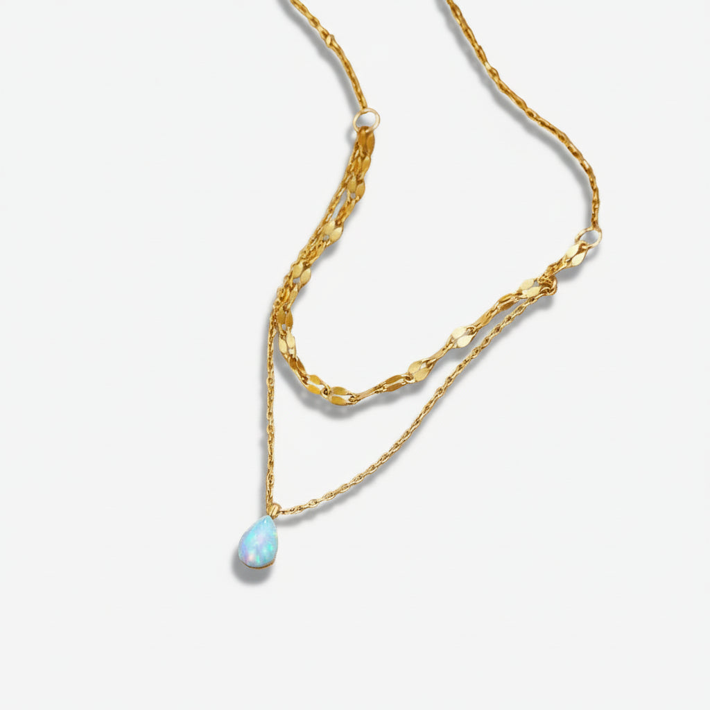 Theresa - Opal Teardrop Layered Necklace features waterproof stainless steel construction that resists tarnishing and fading through daily wear. The opal teardrop pendant delivers a luminous focal point, while the layered design adds sophisticated depth. Adjustable length of 15.15 inches plus 1.77-inch extender ensures a customized fit. Built for durability without compromising on refined aesthetics.