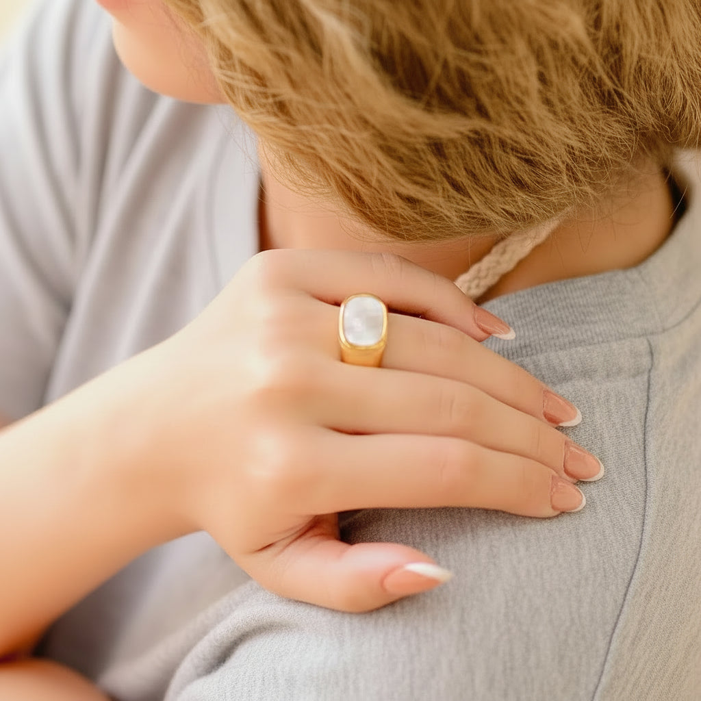 The Lizzie Square Shell Ring combines natural beauty with modern durability. Its lustrous shell centerpiece, set in premium stainless steel with 18k gold plating, creates an understated yet striking focal point. Engineered to withstand daily wear resistant to water, sweat, and heat, this ring maintains its finish without tarnishing. The 14.6mm shell width delivers confident presence while remaining comfortable for all skin types. Available in sizes 52mm, 54mm, and 56mm, it's an ethically crafted piece that transitions seamlessly from everyday elegance to special occasions.