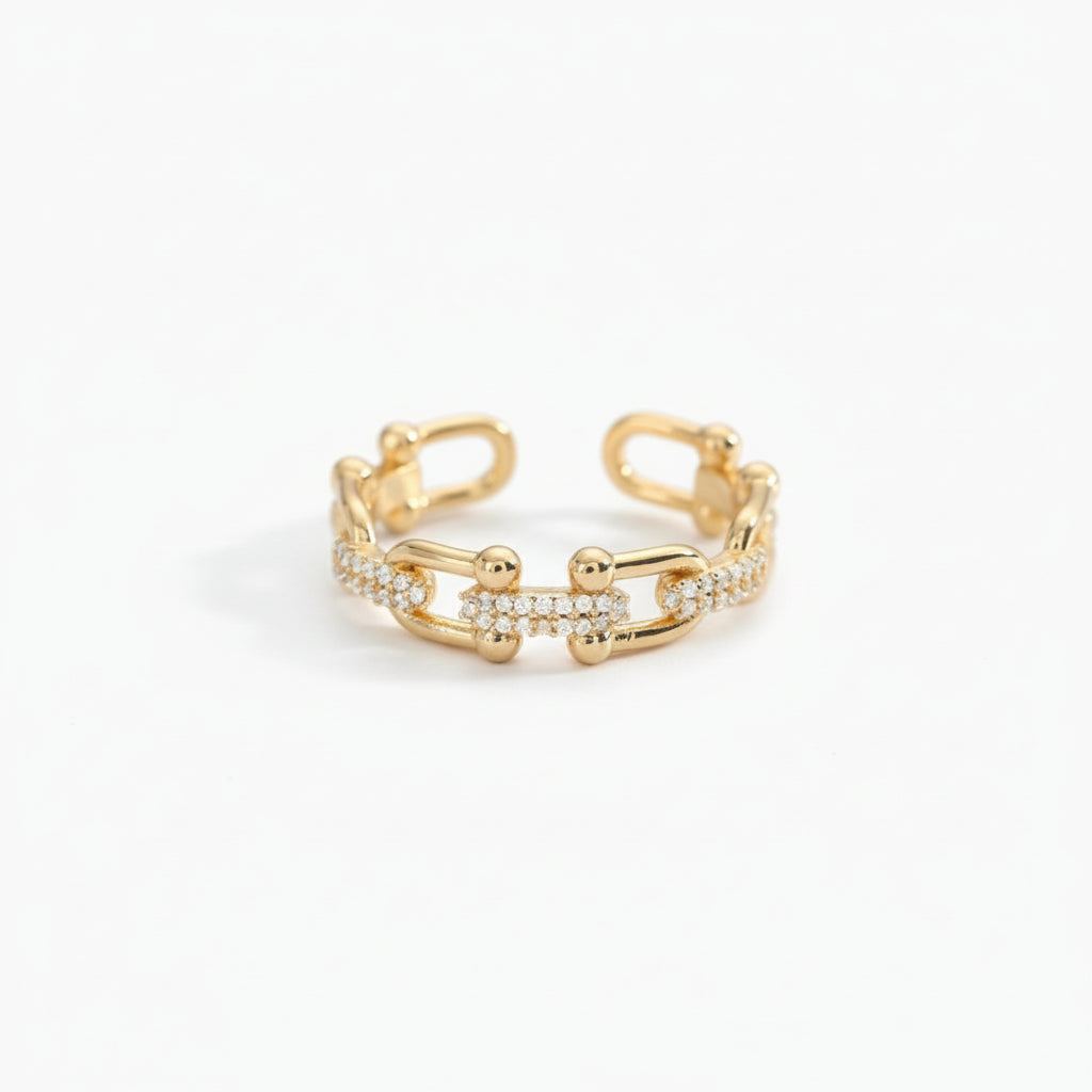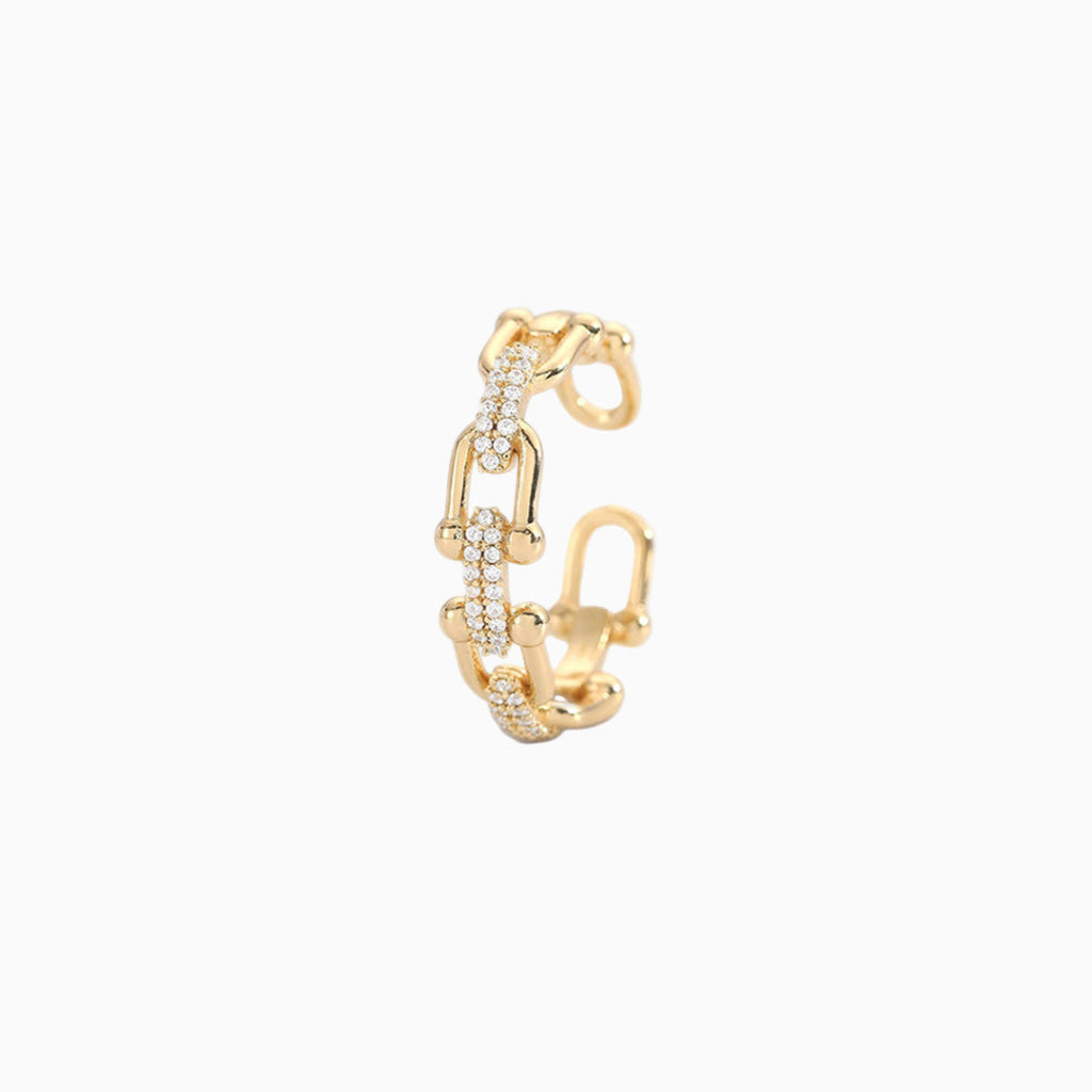 Introducing the Sophie - Crystal Gold Ring, a stunning piece that radiates elegance and sophistication. This beautiful ring is adorned with dazzling diamond simulants, creating a sparkling effect that is sure to turn heads. Its exquisite Gold band features an open-ended design, adding a touch of modern flair that will elevate any outfit.