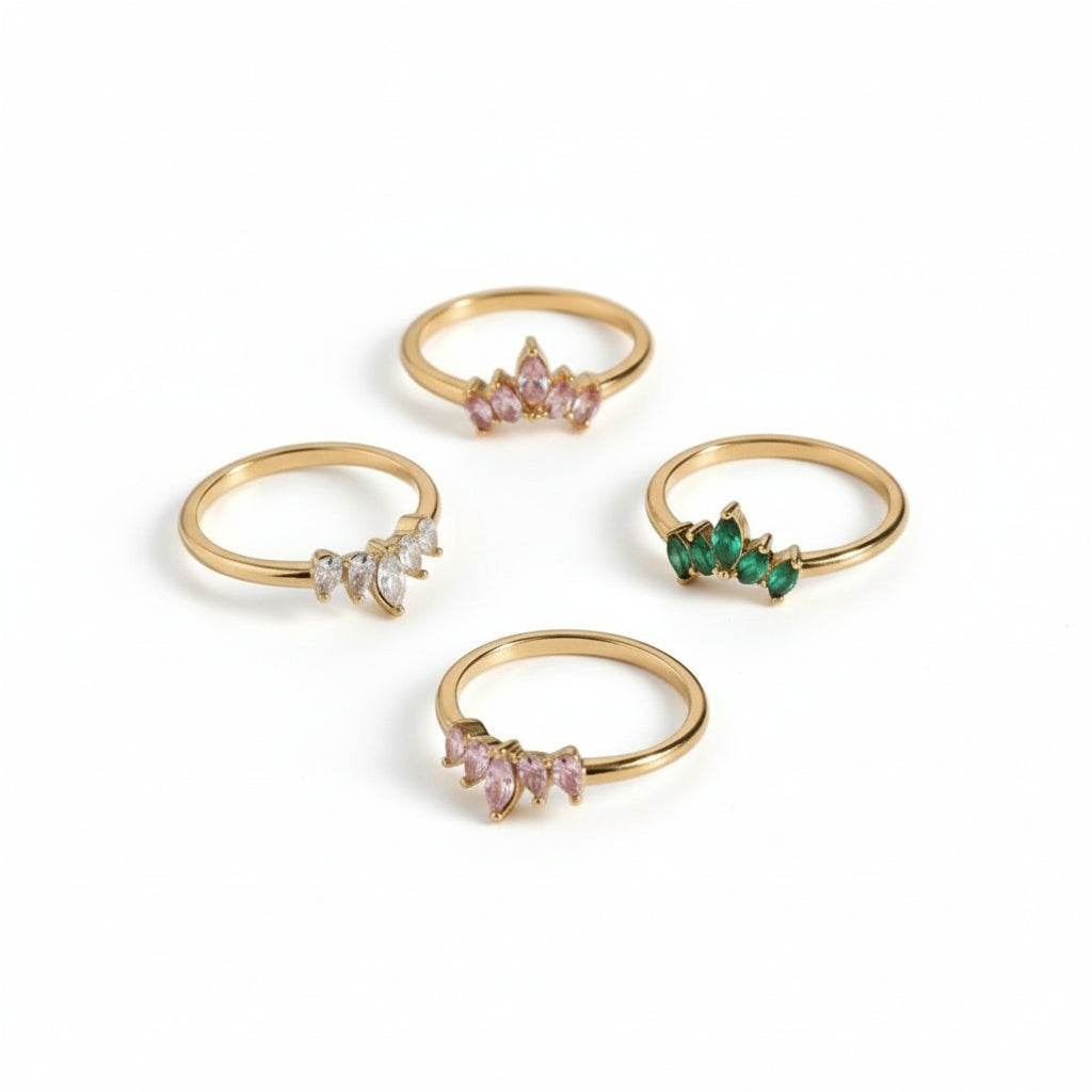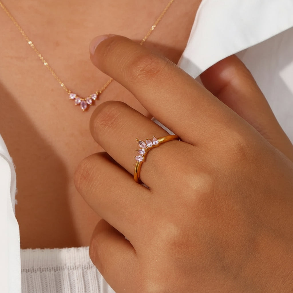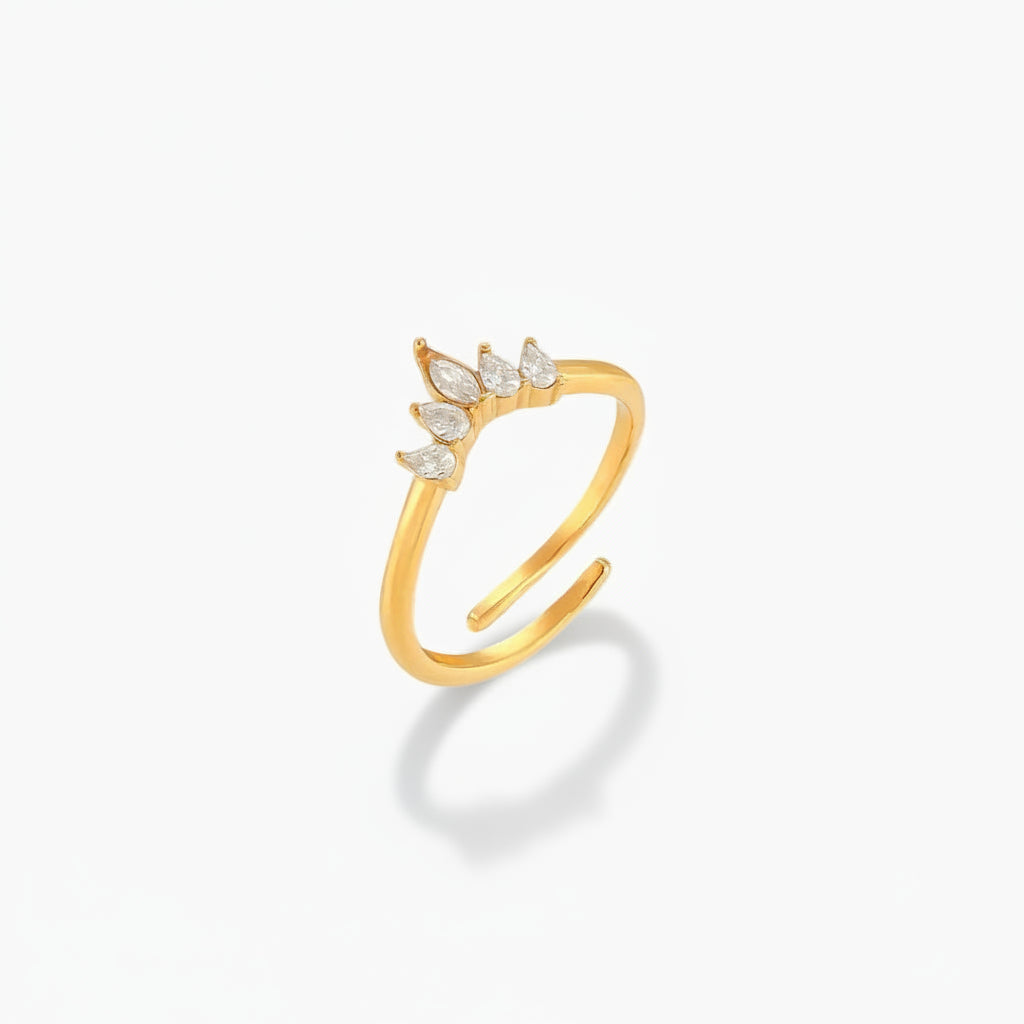 The Imelda Gold Ring combines refined craftsmanship with everyday wearability. This sophisticated piece showcases premium AAAAA diamond simulants set in ethically sourced 18k gold plating over stainless steel, delivering brilliant sparkle with lasting durability. Engineered to resist water, sweat, and heat without discoloration, it maintains its lustrous finish through daily wear. The hypoallergenic composition ensures comfort for sensitive skin, while the adjustable sizing accommodates most finger sizes. At just 5g, this lightweight ring transitions seamlessly from day to evening. Presented in sustainable packaging, it makes a thoughtful gift for those seeking timeless elegance with practical performance.