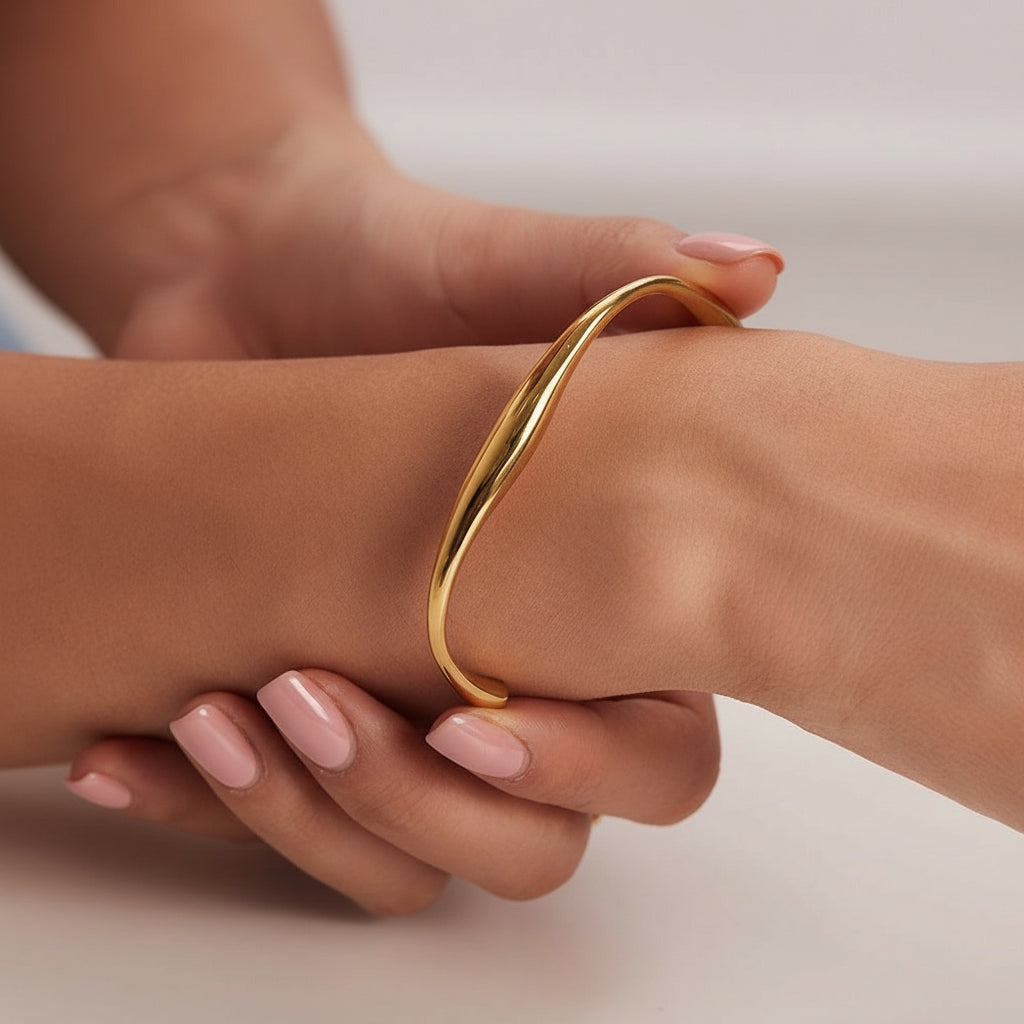 Introducing the Kennedy - Curved Gold Bangle, a stunning and versatile twisted gold bangle designed to elevate any outfit. This exquisite piece adds a touch of sparkle to your wrist while providing unparalleled versatility to your wardrobe. Crafted for modern lifestyles, it is both waterproof and hypoallergenic, ensuring worry-free wear for any occasion.