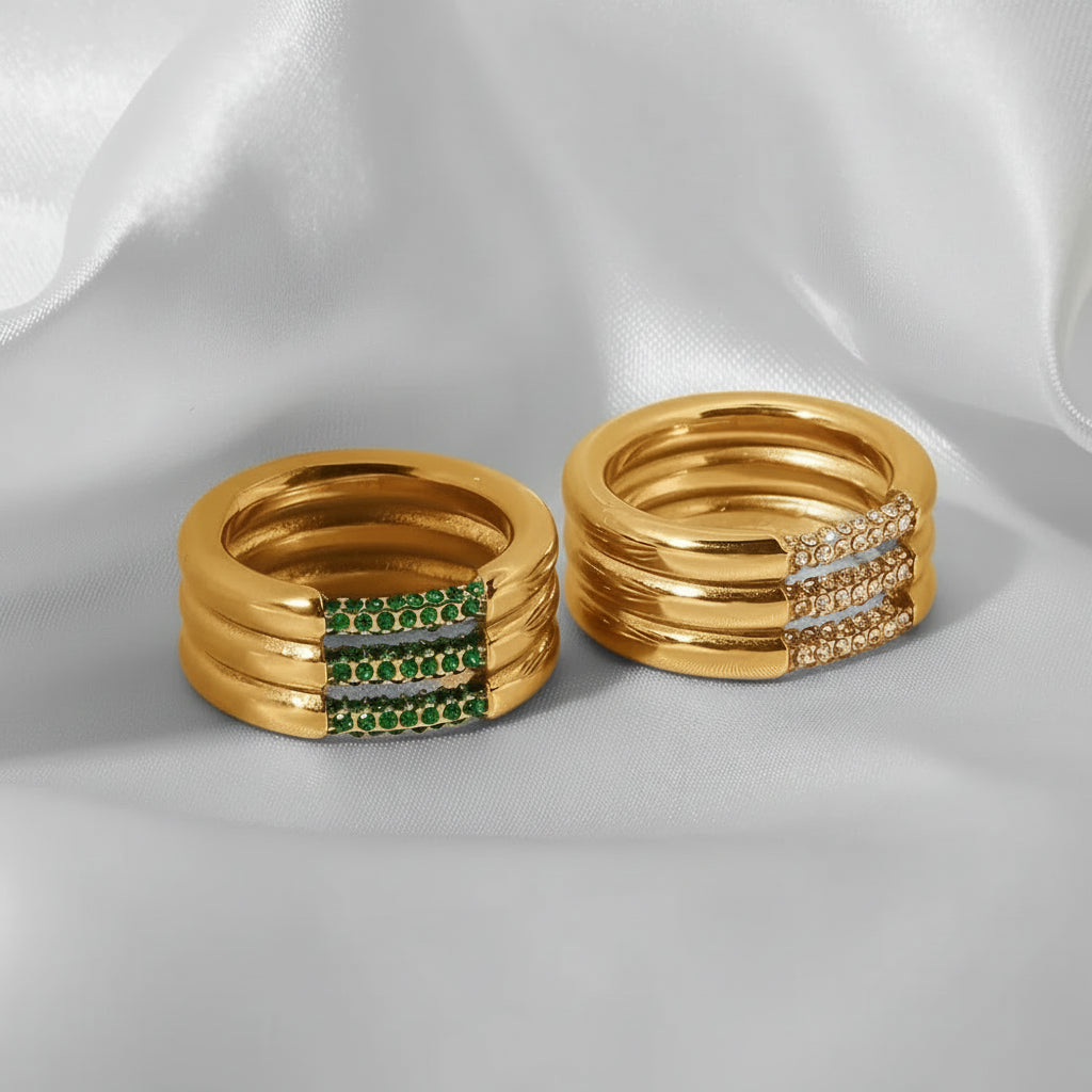 The Morgan - Gold Ring combines stainless steel with 18k gold plating and AAAAA diamond simulants for a brilliant, luxurious look. Built to resist water, sweat, and heat, it maintains its sparkle through daily wear without tarnishing. Hypoallergenic materials suit all skin types. Standing 10 mm tall and weighing 11 g, it's available in sizes 52–56 mm. Sustainably packaged.
