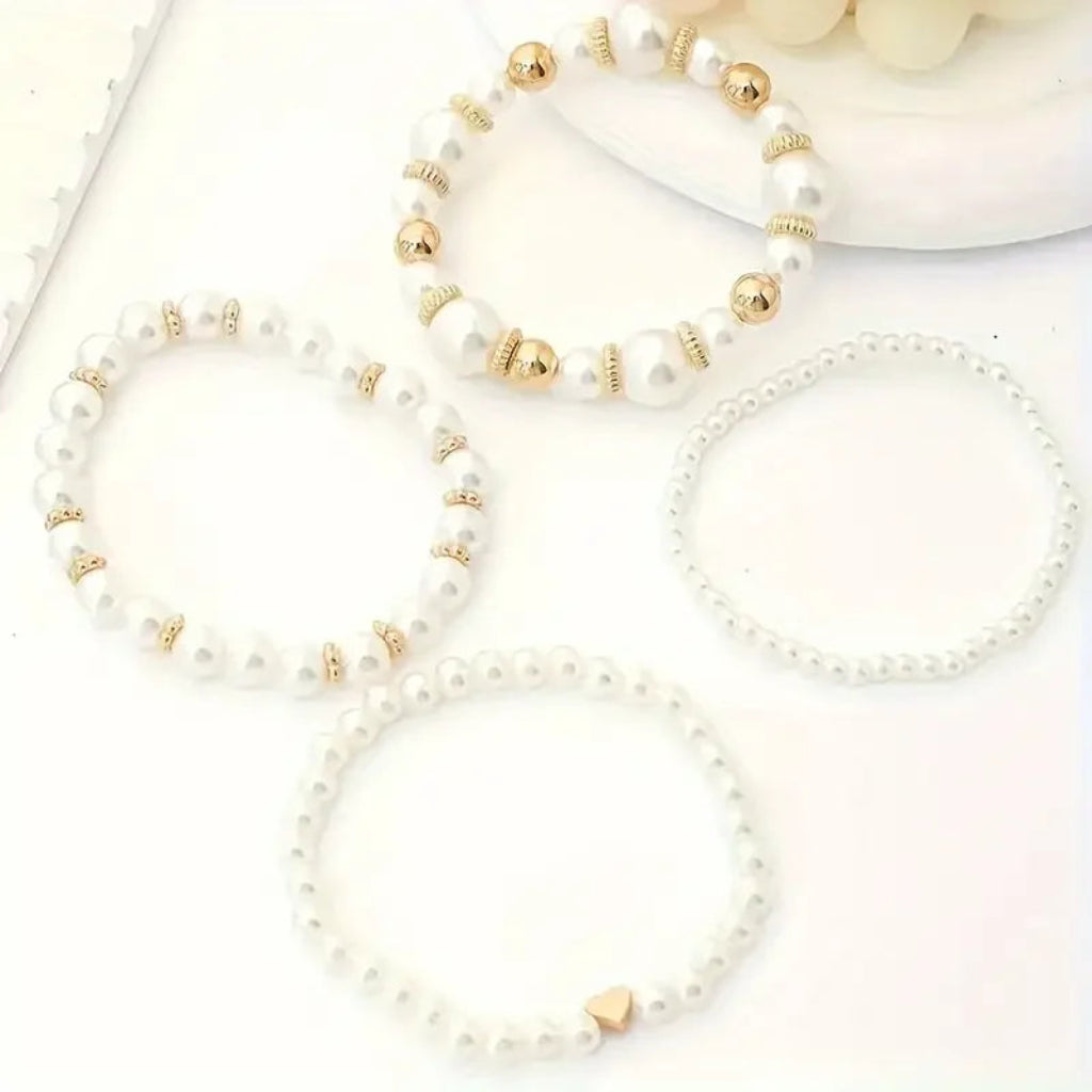 Discover the Thalia collection—a curated four-piece bracelet ensemble that marries pearl elegance with refined gold detailing. Each bracelet brings distinct character: a romantic pearl-and-charm piece, a statement-making chunky pearl design with gold separators, a delicate single-strand option for layering, and a structured pearl bracelet with evenly spaced gold dividers. Constructed from durable stainless steel and copper with lustrous imitation pearls, this versatile stack delivers sophisticated styling for any occasion, whether worn individually or layered for maximum impact.